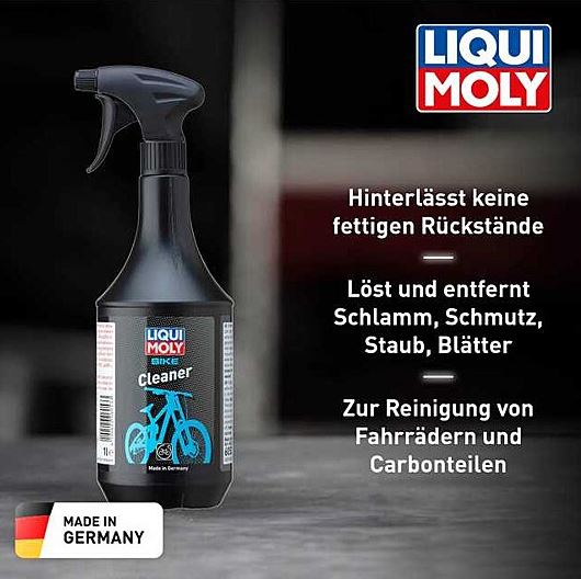 Liqui Moly Bike Cleaner ist ein hochwirksamer, biologisch abbaubarer Reiniger. Speziell für stark verschmutzte Fahrräder. Löst und entfernt Schlamm, Schmutz, Staub, Blätter usw. schnell und einfach. Hinterlässt keine fettigen Rückstände und hat keinen Einfluss auf die Bremswirkung.